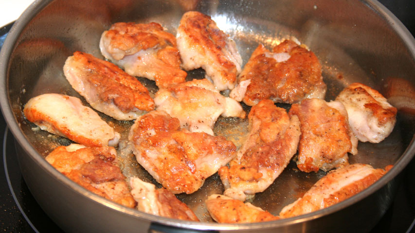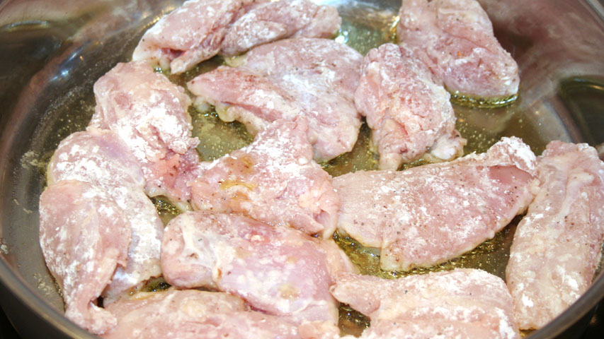 El pollo salpimentado y enharinado se dora en aceite de olivaPodéis usar cualquier parte del pollo para hacerla: pechuga, muslos, etc. pero yo la he preparado con contramuslo deshuesado. Los he deshuesado yo que no soy ningún figura como carnicero, pero me gusta hacer estas cosas (¿estaré mal de la olla?). De todas formas, si no os apetece realizar esta operación se lo podéis pedir a vuestro carnicero que seguro que no tiene inconveniente en hacerlo.