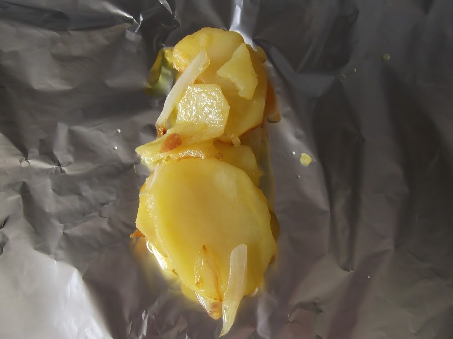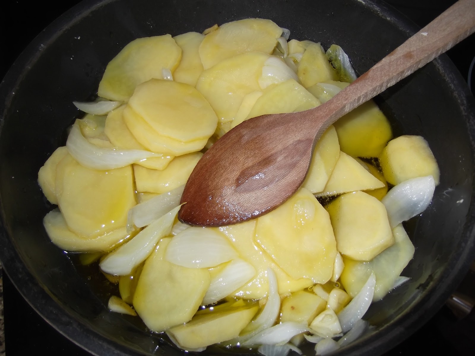 Lo primero que hacemos es pelar los ajos en láminas. El siguiente paso echamos un poco de aceite en una sartén y ponemos los ajos para que se doren. Cortamos la cebolla en juliana y la ponemos a pochar, cuando ha tomado un poco de color ponemos las patatas que las habremos cortado como si fueran para tortilla (salarlas con antelación),. A mi me gusta más freír estos alimentos, ya que luego están mejor a la hora de comerlos, aunque si no queréis podéis ponerlos crudos antes de meterlos al horno, en ese caso cortar las patatas muy finas con una mandolina para que no se os queden crudas.