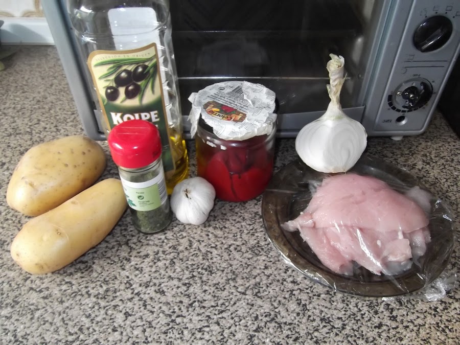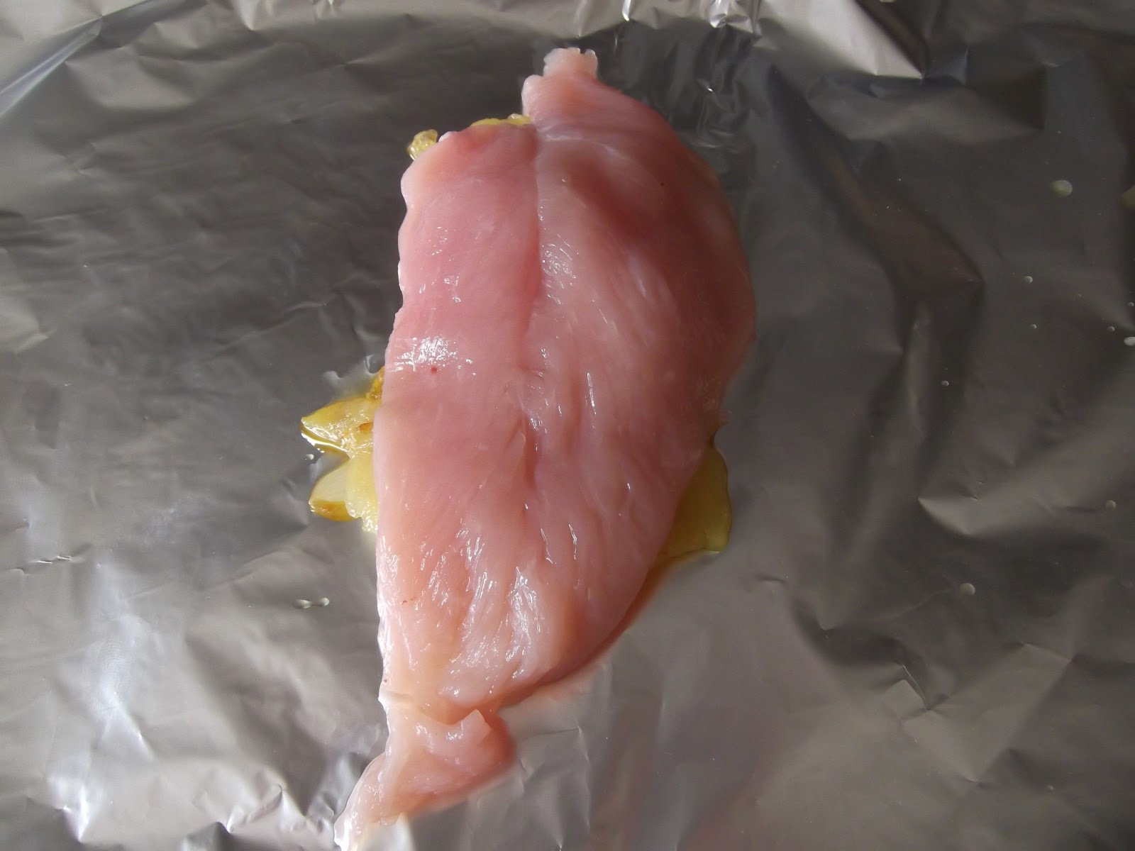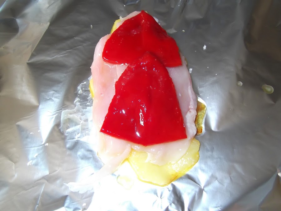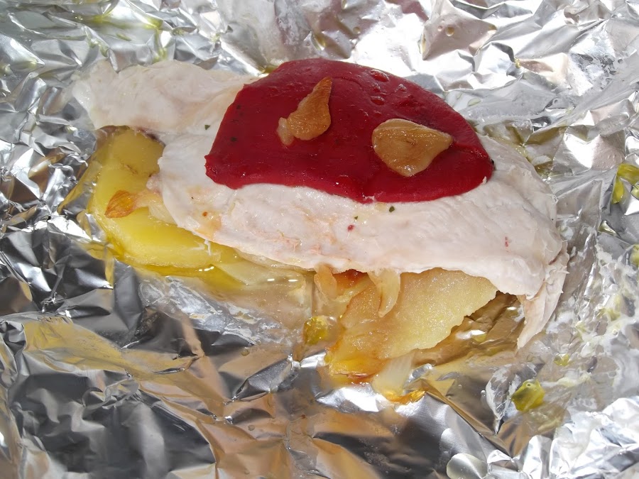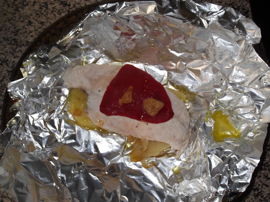 Pasados 20 minutos, ya tendréis vuestros alimentos listos, daros cuenta que luego van a pasar un rato en el horno. Ahora sólo nos queda hacer el papillote, cortamos un trozo de papel albal y encima ponemos nuestro sofrito, el filete de pollo y el pimiento del piquillo. Cerramos nuestro paquete y lo colocamos en la bandeja del horno.