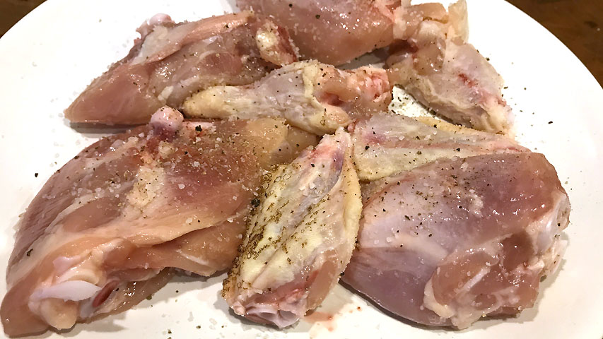 Lo primero es salpimentar los trozos de pollo.