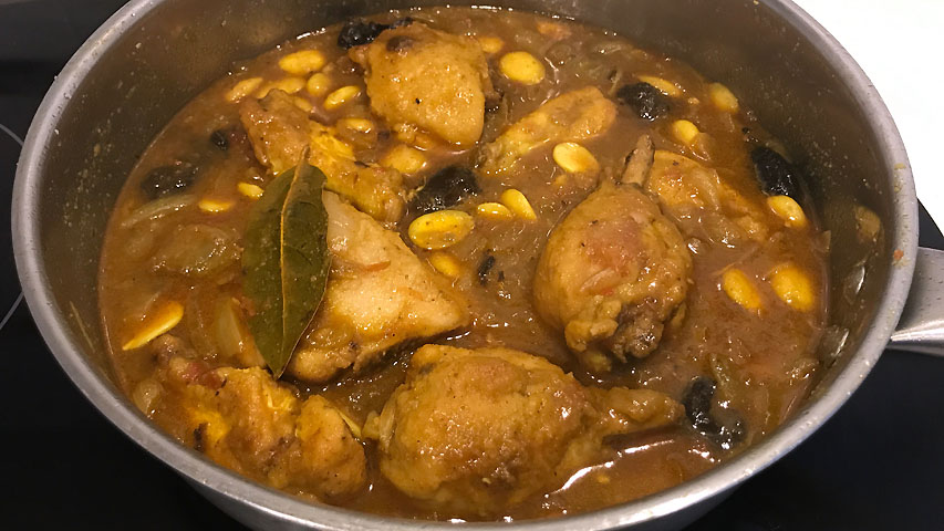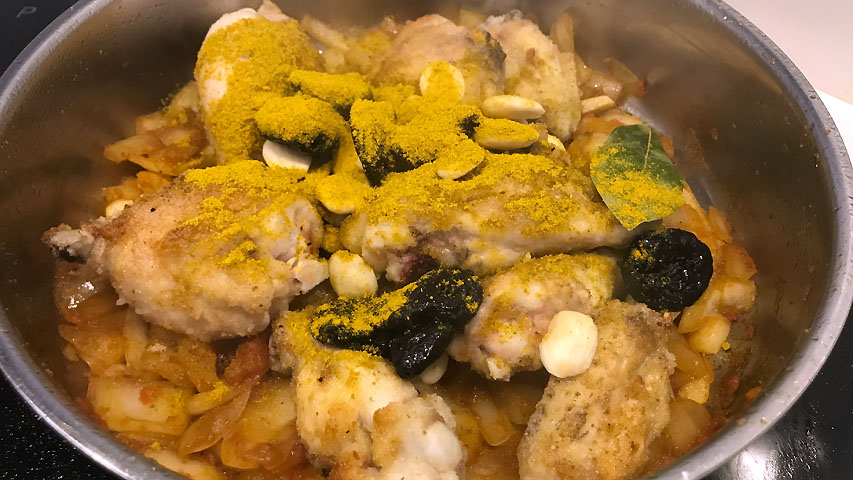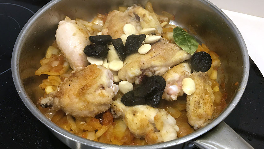 Regresa el pollo a la cazuela e incorpora las almendras, las ciruelas y la hoja de laurel.