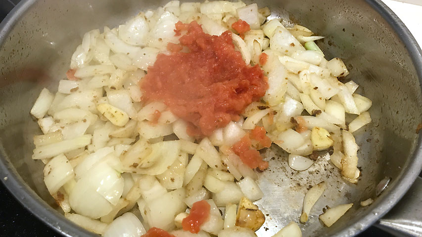 El tomate rallado o picado también aportará humedad para desglasar la cazuela. Este era un tomate con mucha carne y poco líquido y no aportó mucha humedad.