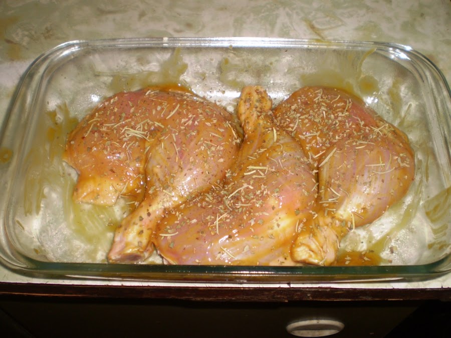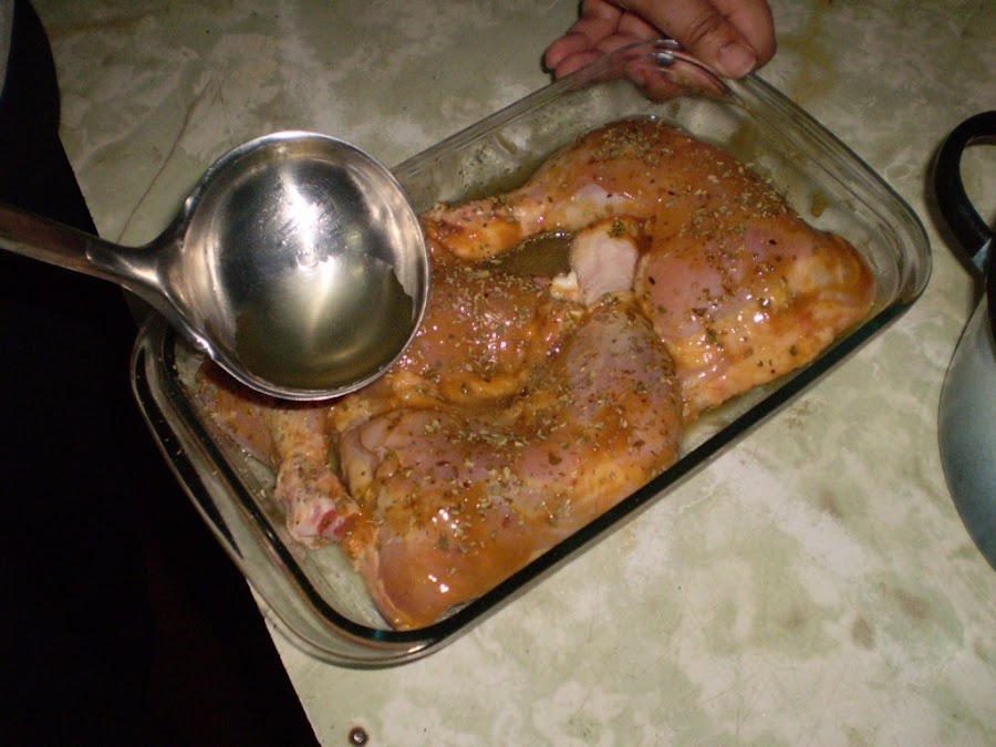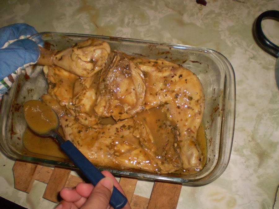 Llevar al horno por 30 minutos aproximadamente a 220º. A la mitad de tiempo, dar vuelta el pollo. IMPORTANTE: cada cierto tiempo, quitar la fuente y ?bañarlo? en su propio jugo? así los sabores penetran más y llegan hasta el hueso.