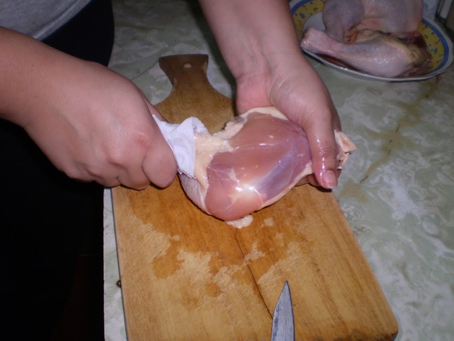 Limpiar bien el pollo y quitarle la piel y la grasa que pueda tener. UNA TECNICA para quitar la piel: con una mano sujetamos fuerte del hueso de la pata y con un pedazo de papel de cocina, tomamos la piel y estiramos de manera fuerte y pareja. Sale la piel entera y rápido!