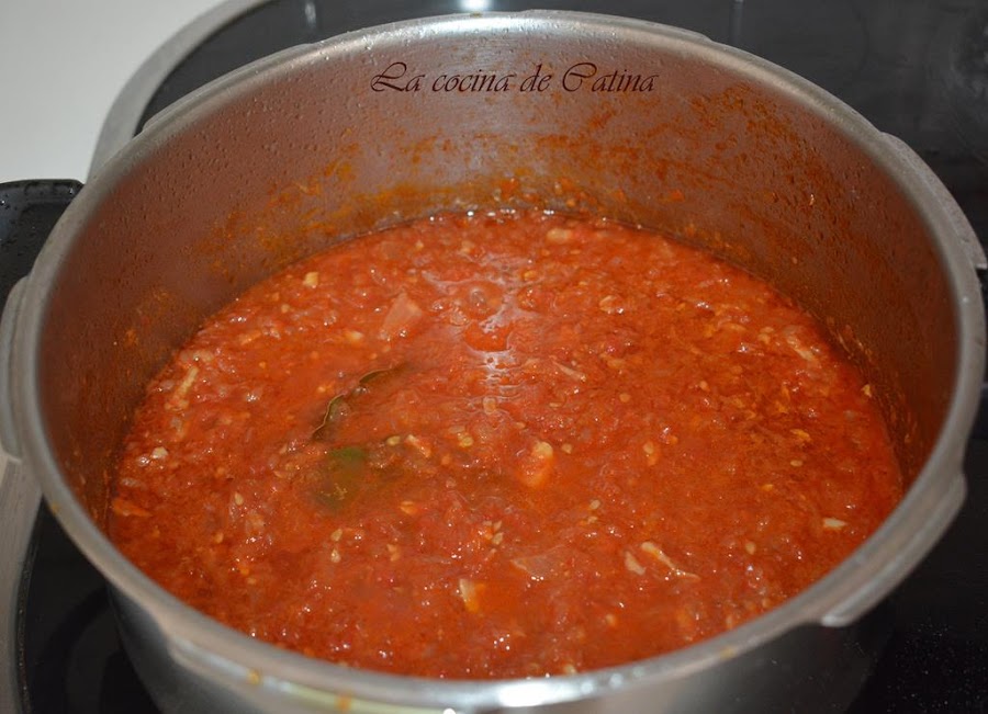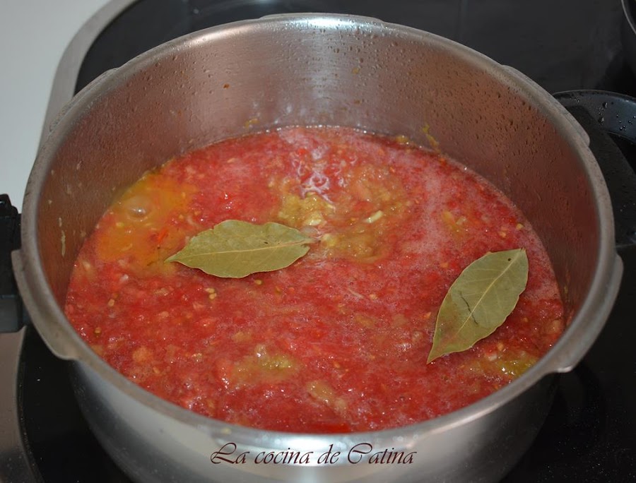 Añadimos los tomates, la cucharadita de azúcar y las dos hojas de laurel, freímos hasta que se evapore toda el agua que suelta el tomate.