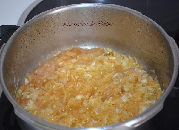 Una vez que hemos frito todo el pollo, en el mismo aceite freímos la cebolla y los ajos durante unos diez minutos, o hasta que esté bien pochada.