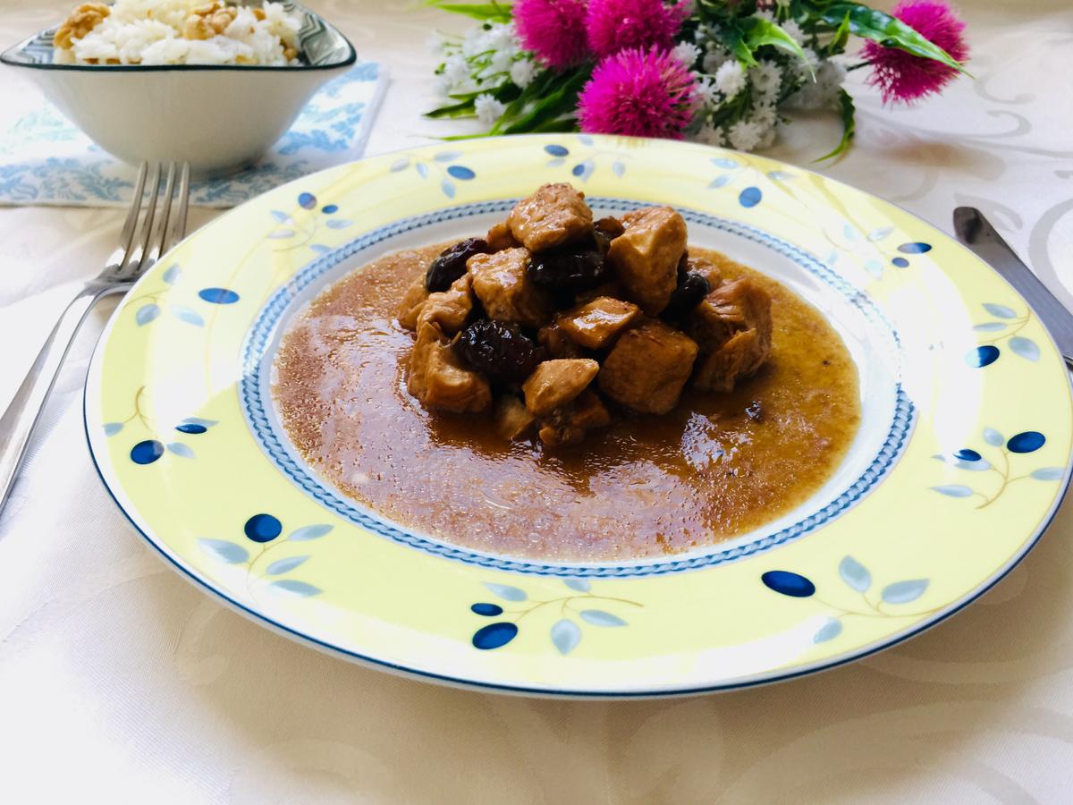 A este pollo le va muy bien una guarnición de arroz blanco. A mí me gusta acompañarlo de basmati cocido (así, tal cual, sin nada más) mezclado con unas nueces, pero unas patatas cocidas o unas chalotas rehogadas le van también genial.