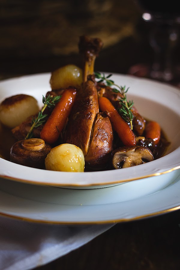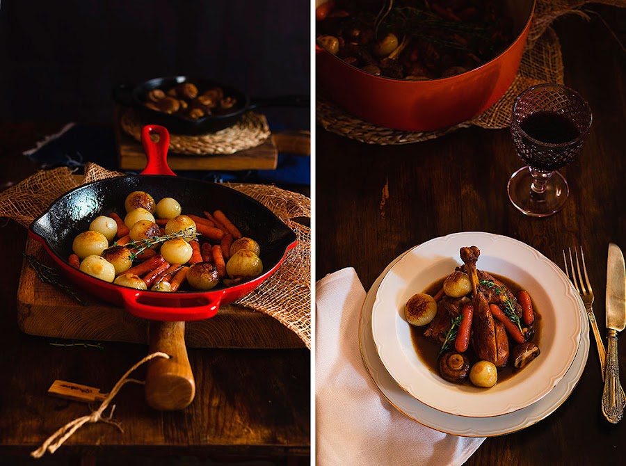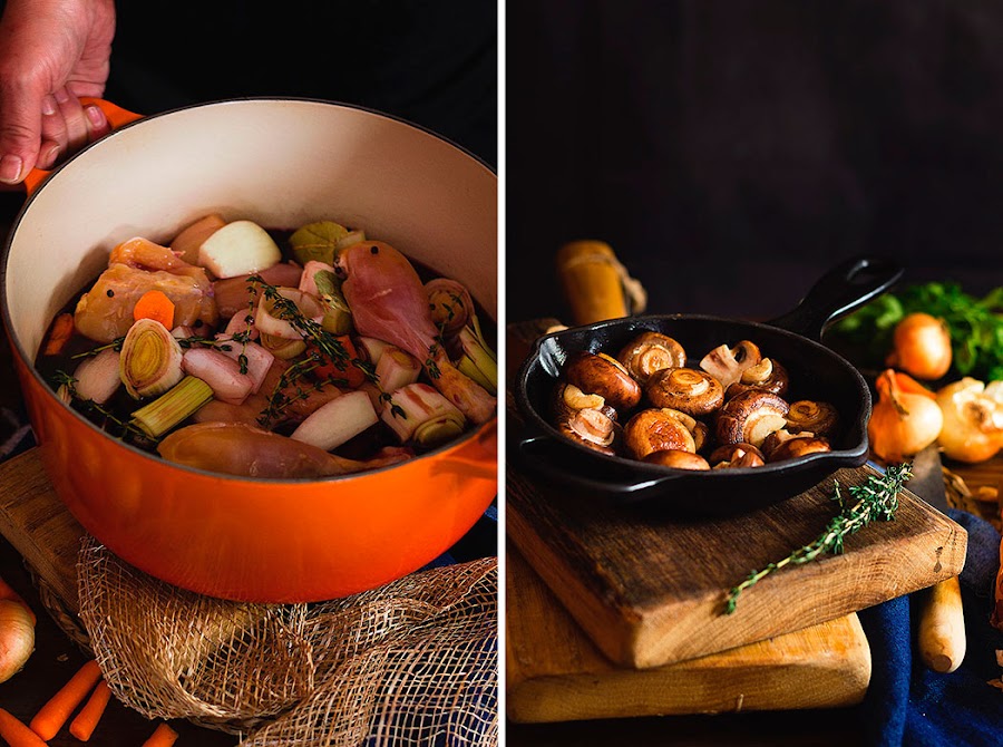 Añadimos entonces el pollo, los champiñones, las cebollitas francesas glaseadas y las zanahorias. Dejamos cocinar 10 minutos a fuego suave para que se integren todos los sabores. Servimos bien caliente.