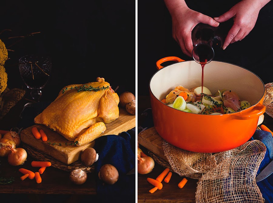 ELABORACIÓN:Cortamos el pollo en trozos, retiramos la piel y el exceso de grasa y ponemos en la cazuela o cocotte. Preparamos entonces la marinada, cortando las cebollas, el puerro y las zanahorias en rodajas y volcamos sobre el pollo. Machacamos los ajos y los incorporamos a la cazuela junto al tomillo, el perejil, los granos de pimienta y la hoja de laurel. Cubrimos con el vino tinto y dejamos macerar en la nevera durante 24 horas.