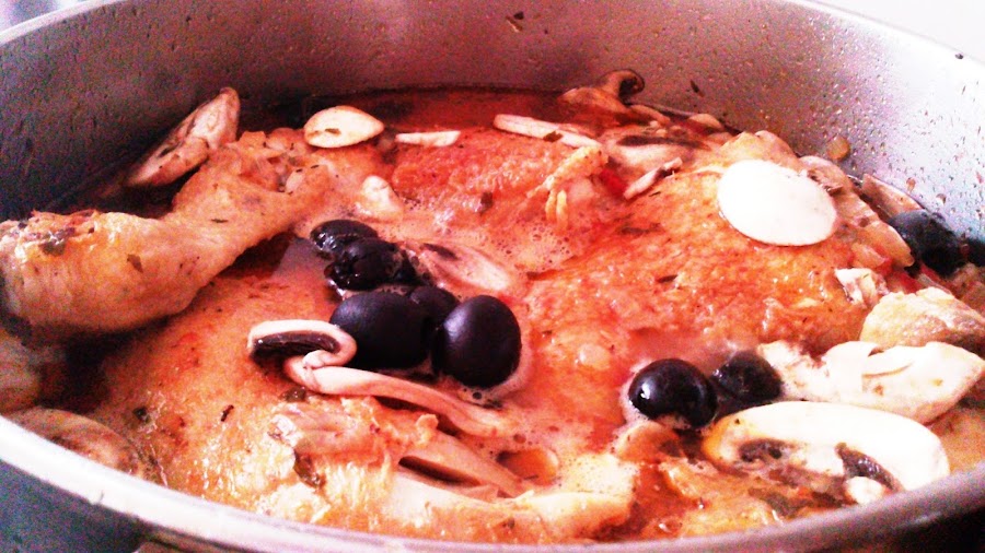 Cocemos a fuego muy lento, moviendo a menudo, con cuidado de que no se pegue. Media hora antes de servirlo añadimos unos champiñones, las aceitunas negras y el hígado. Añadimos el vasito de cognac o brandy con la cacerola destapada para que se evapore.