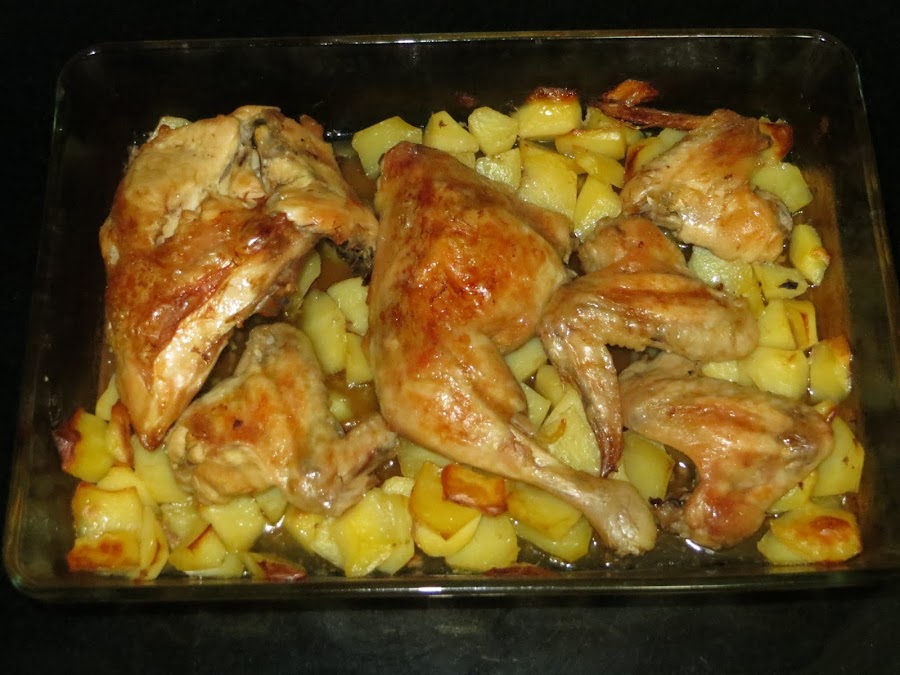 En una bandeja apta para horno salpimentamos por ambos lados el pollo con la piel hacia arriba y lo embadurnamos con aceite y con media lata de cerveza. Pelamos y cortamos las patatas en trozos y metemos al horno a 200º durante 40 minutos.