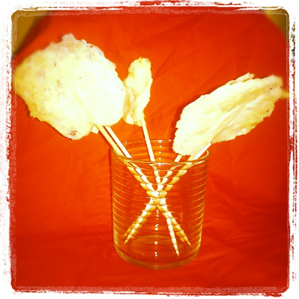 Las piruletas de queso son muy sencillas,alguna vez las he echo en el microondas, hoy en el horno papel de horno, montoncitos de queso rallado, y unos palitos de pincho moruno que simulen el palo de la piruleta, ponemos los palos encima de los montones, tapamos los montones con mas papel de horno y ponemos encima algo duro y resistente para aplastarlos montones, yo lo hice después de sacar el pollo, y utilice las dos bandejas de horno que tengo y listo, se derrite el queso.