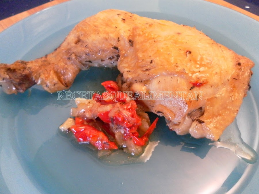 Un pollo de 2 kg, 2 cebollas, un pimiento rojo, 3 dientes de ajo, una hoja de laurel, perejil, tomillo, romero, albahaca, pimienta negra molida, una copa de brandy, aceite de oliva, 300 ml agua, sal.