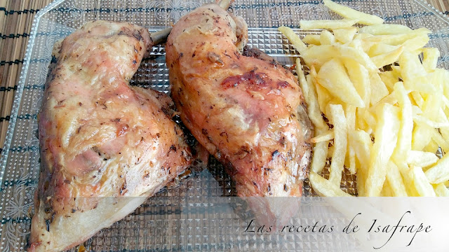 A continuacion lavamos el pollo y le ponemos la mitad de la mezcla de especias y lo metemos en la cubeta y programamos 30 min a 200° despues darle la vuelta poner el resto de mezcla de especias y poner otros 30 min a 200° pinchar y si veis esta crudo dejar 10 min mas darle vueltas hasta que veais esta dorado a vuetro gusto quedara muy bien y el caldo con especias buenisimo espero os guste como a mi.