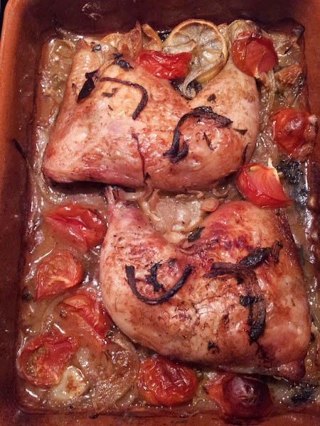 Regamos la bandeja con el vino blanco y lo metemos en el horno ya calentado. Dejamos que se vaya cocinando durante 30 minutos. Abrimos y damos la vuelta al pollo. Lo vamos hidratando con la salsa para que no quede seco.