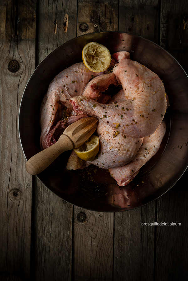 En un cuenco grande mezclamos todos los ingredientes del adobo y metemos el pollo, con ayuda de las manos limpias mezclamos bien para que se impregnen todas las piezas. Dejamos deposar un mínimo de 2 horas.