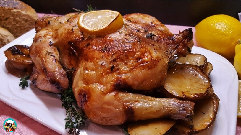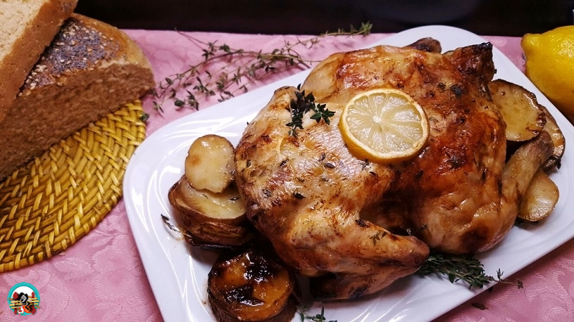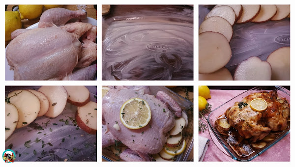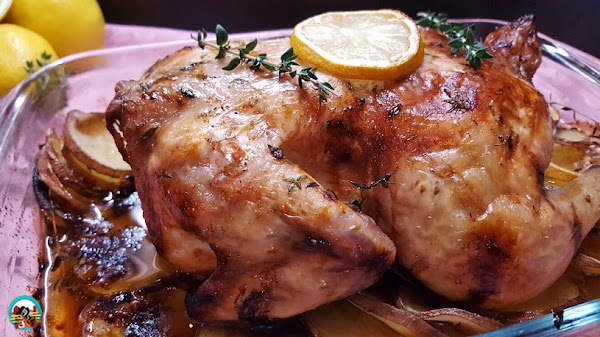 3.- Precalentamos el horno a 180º, cocinamos el pollo 35 o 40 minutos hasta que esté bien dorado, le damos la vuelta al pollo, le ponemos otra rodaja de limón y cocinamos 35 minutos. Lo rociamos cada 15 minutos con el jugo de la bandeja. Lo retiramos del horno y servimos en una bandeja con la papas. Lo servimos con la salsa de la fuente.