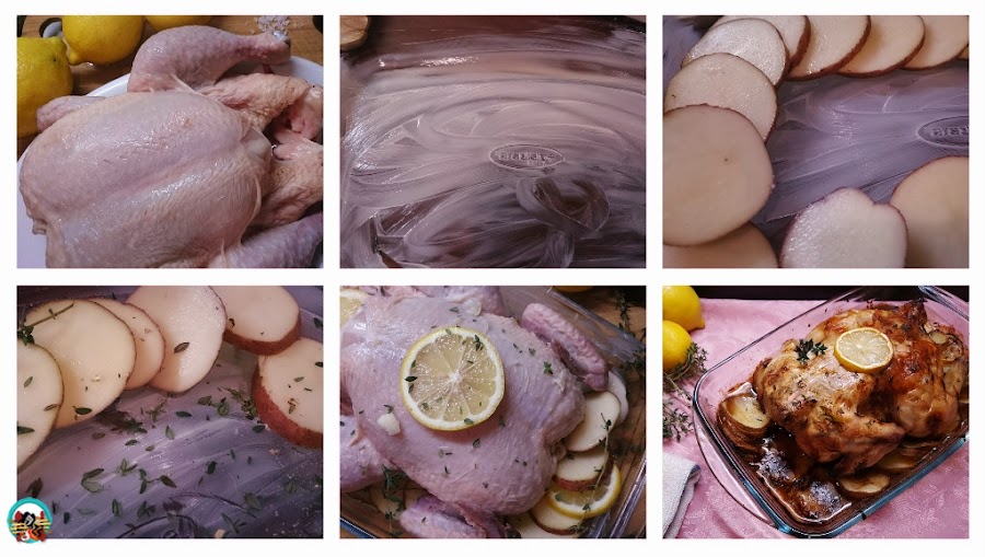2.- Frotamos el pollo con la mitad de un limón. Le rallamos por encima un ajo, sobre las papas rallamos el otro ajo. Salpimentamos al gusto. Lo colocamos en el medio de la fuentes con las papas alrededor. Rociamos el pollo con aceite de oliva, lo ponemo en el centro una rodaja de limón. Disponemos algunas rodajas de limón entre las rodajas de papas cortadas.