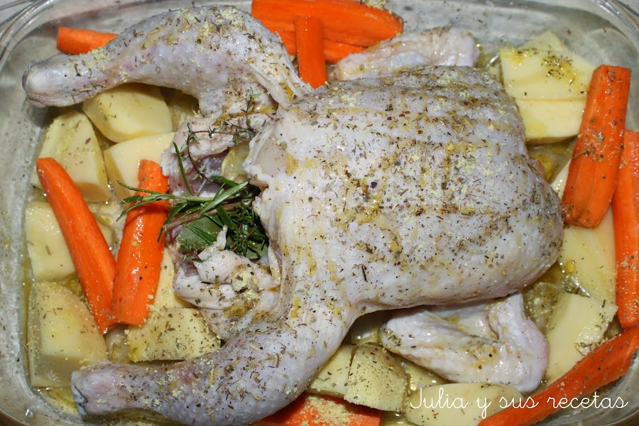 Colocamos el pollo encima de las patatas y zanahorias y lo regamos con el vino blanco, lo espolvoreamos todo con sal, pimienta molida y orégano molido. Le echamos un os chorritos de aceite de oliva por encima .