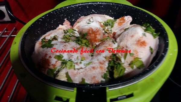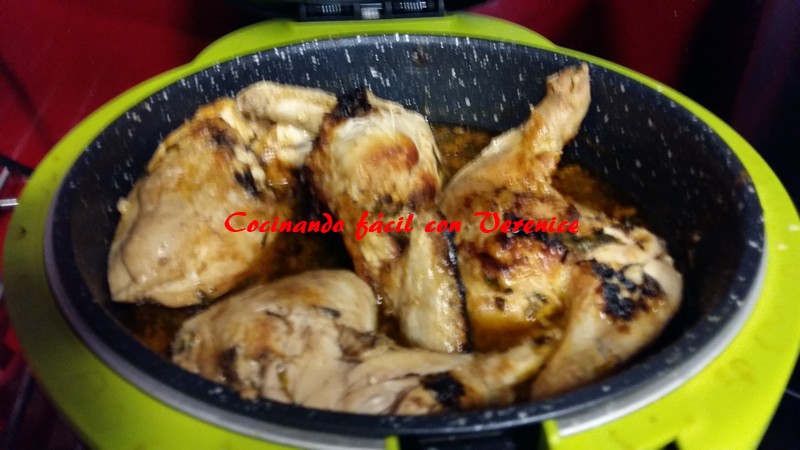 Se coloca la cubeta dentro de la freidora y se programa el menú Saltear 20´180º. Al necesitar 60´ para asarse totalmente el pollo tendremos que volver a programar dos veces más, solo el tiempo, ya que éste programa tiene de máximo 20´.