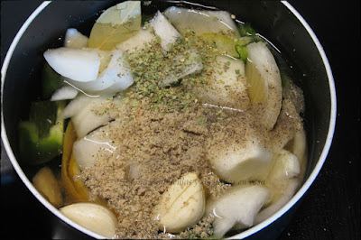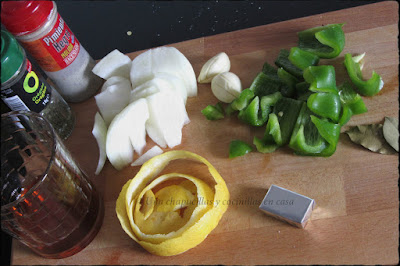 De mientras vamos a preparar la salsa. En un cazo ponemos la media cebolla troceada en piezas grandes, asi como el medio pimiento, los dientes de ajo enteros, las hojas de laurel, el orégano, la cascara del limón, el agua, el vino blanco, la media pastilla de caldo, un chorrito de aceite de oliva, sal y pimienta.