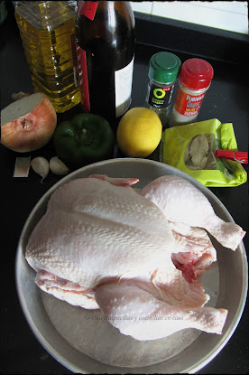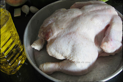 Mientras se estaba cocinando la salsa, hemos puesto el pollo en una fuente adecuada para el horno y lo hemos "frotado" con aceite de oliva y salpimentado (o solamente con sal).