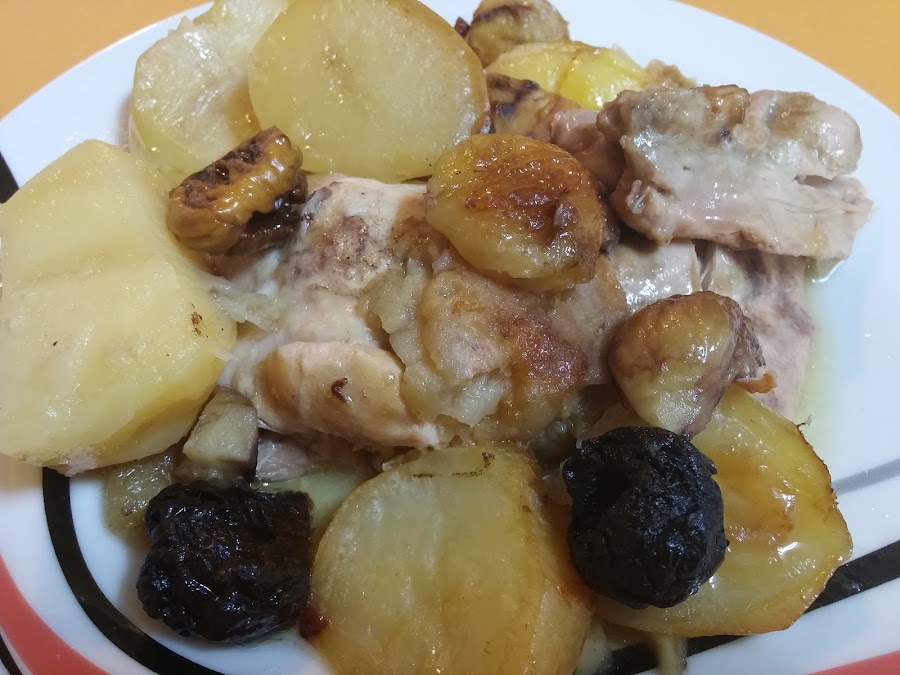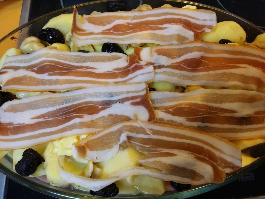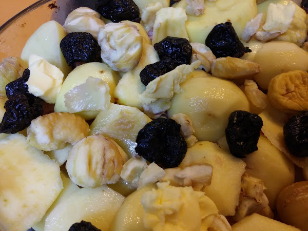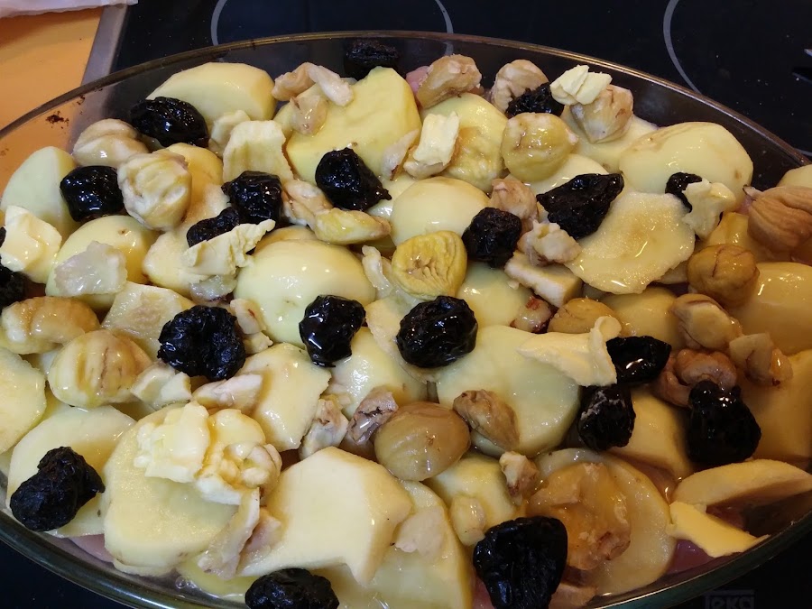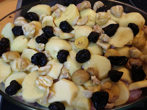 Ahora las ciruelas y las castañas. Y ponemos unos trocitos de mantequilla por encima.