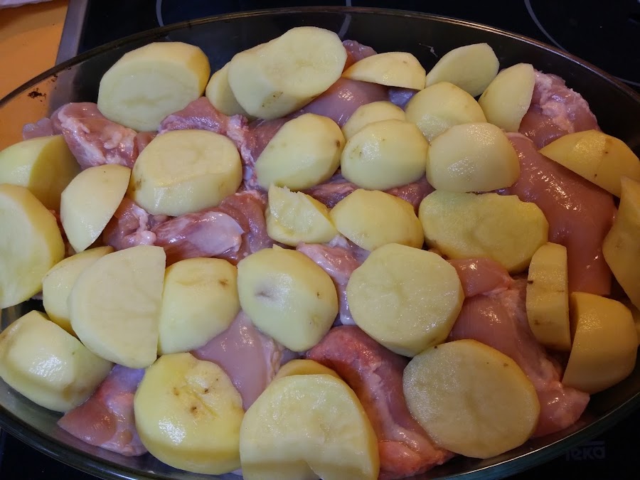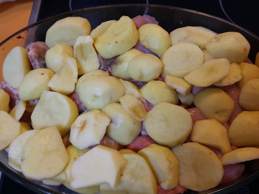 Ahora pelamos las patatas y las cortamos a trozos grandes. Ponemos a precalentar el horno a 200 grados.