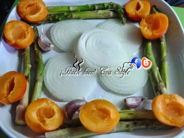 2.- En una fuente de horno ponemos los espáragos, la cebolla en el centro cortada en rodajas, los albaricoques y los dientes de ajo.