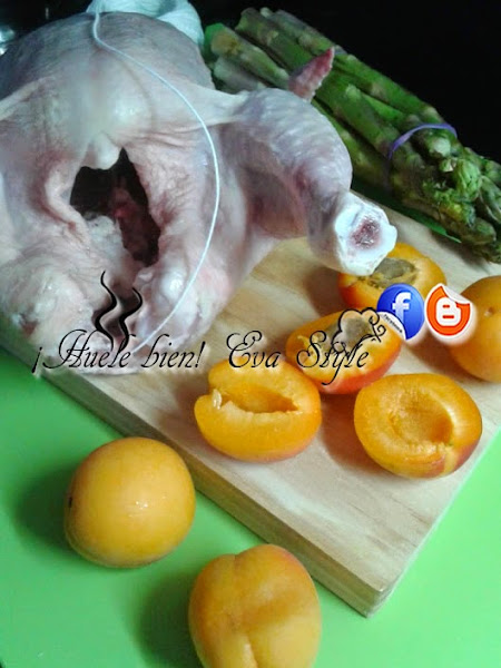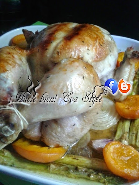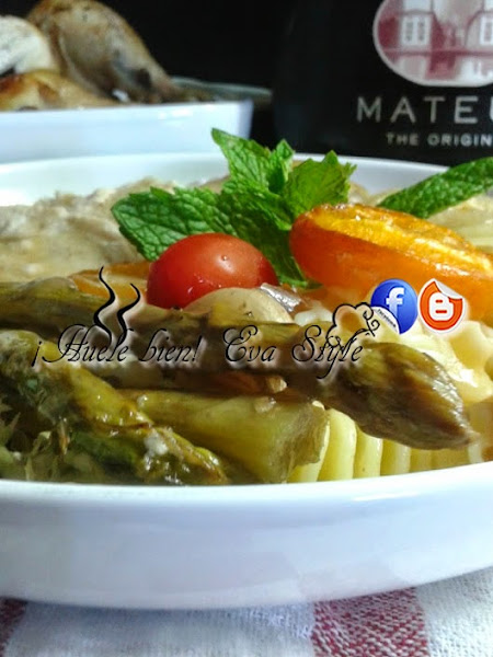 Pollo asado con espárragos trigueros y albaricoques, acompañado con una ensalada de pasta y una salsa de vino dulce con soja y vainilla.