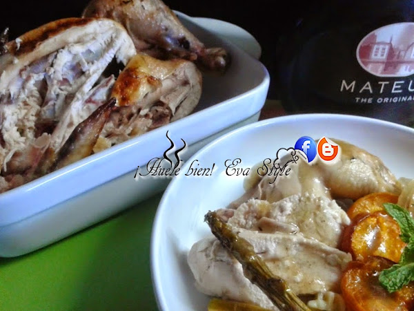 4.- Mezclamos el vino con el vinagre y la cuchara de azúcar. Bañamos el pollo con el vino dulce. Cocinamos 60 minutos a 180ºC.