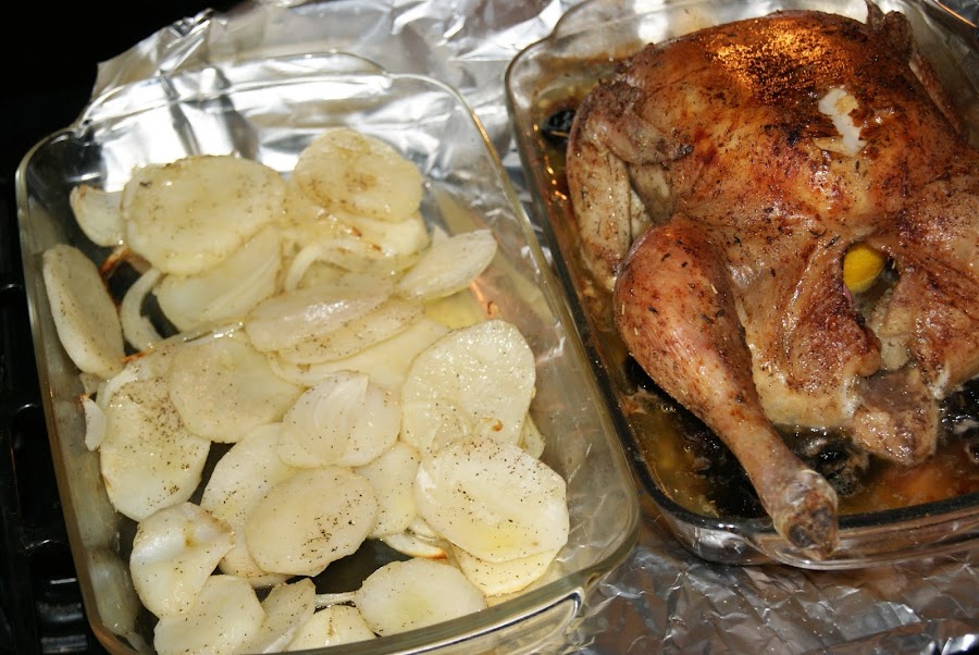 Preparamos el pollo como siempre (ver receta de pollo asado paso a paso) . Limpiamos la piel y condimentamos por dentro por fuera con la pimienta, hierbas provenzales y pastilla de avecrem. Metemos medio limón y unos ajos dentro y también unos ajitos por fuera, sin pelar. Añadimos un vaso de agua a la bandeja. Lo introducimos al horno precalentado a 185º-190C y programamos dos horas si es un pollo grande. Este pesa 1,800 g.y ha estado dos horas en el horno.