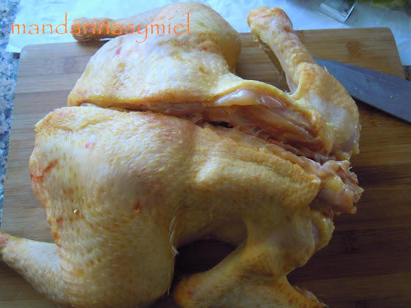 Para comprobar que está hecho, inserta un cuchillo en la parte más gruesa del muslo y presiona con el cuchillo hacia abajo, si el jugo que sale es transparente y no sale sangre...el pollo está hecho.