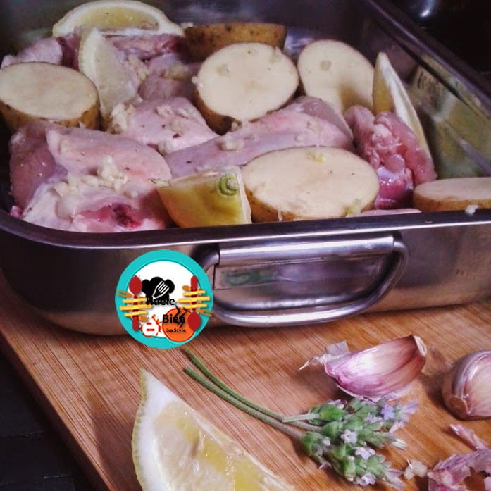 1.- Ponemos el pollo, limpio y troceado en una fuente de horno, lo salpimentamos. Lavamos bien las patatas, las cortamos en dos trozos con la piel, y la ponemos en la fuente con los ajos picados. Cortamos un limón en gajos y lo distribuimos por la fuente.