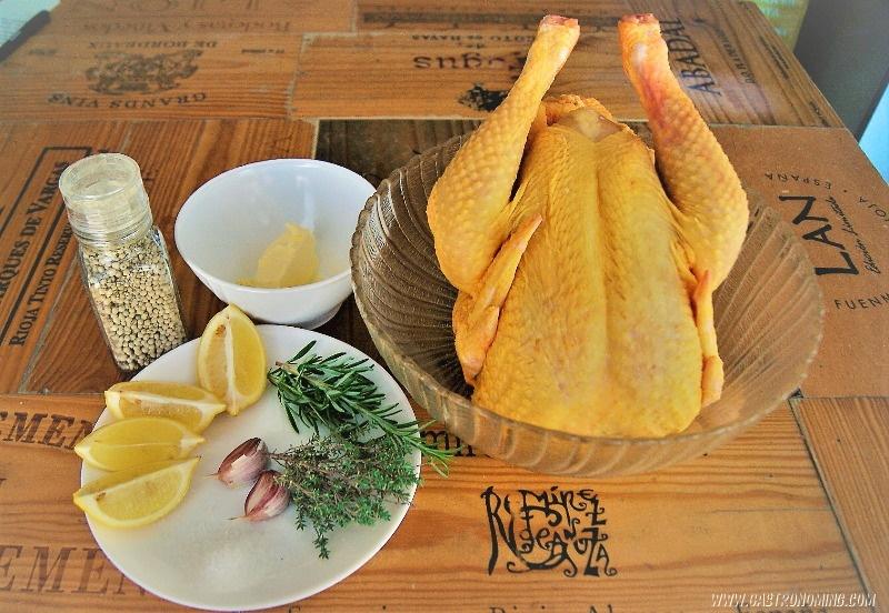 4. En el interior del pollo metemos la otra rama de romero entera, las 2 ramas de tomillo enteras y el trozo de ¼ de limón.