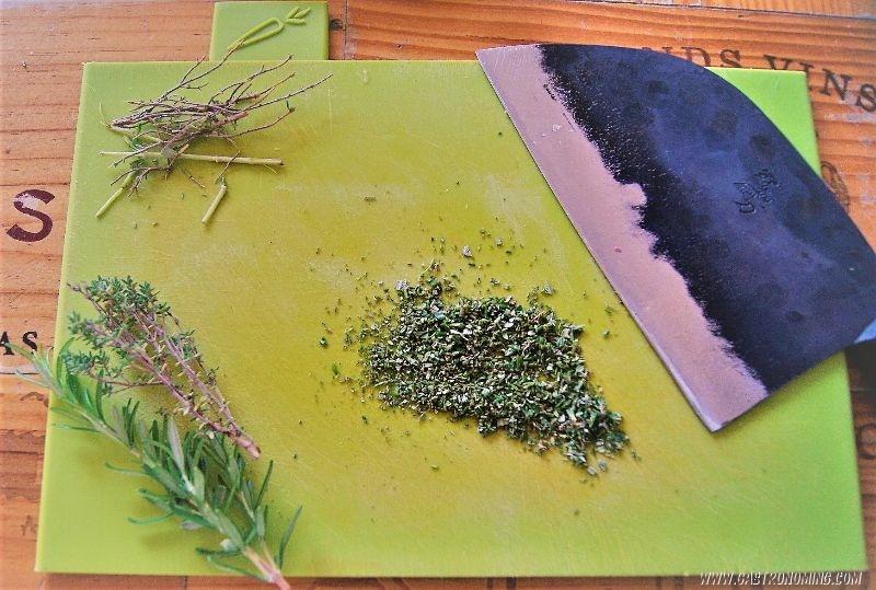 1. Trituramos los ajos o los picamos mucho hasta obtener casi una pasta.2. Picamos muy fino 1 rama de romero (solo hojas) y 2 ramitas de tomillo (solo hojas).