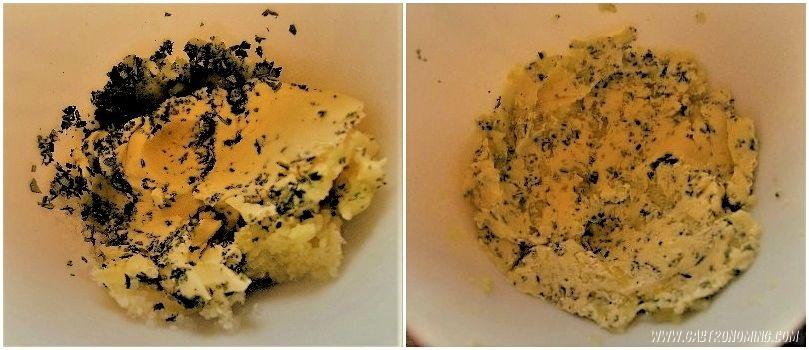 Mezclamos la mantequilla con la sal, pimienta blanca, los ajos triturados, el zumo de ¼ de limón y las hierbas que hemos picado hasta obtener una pasta homogénea.
