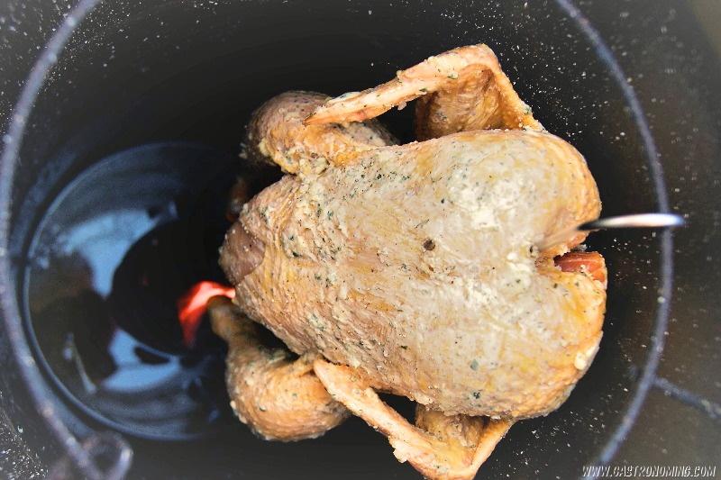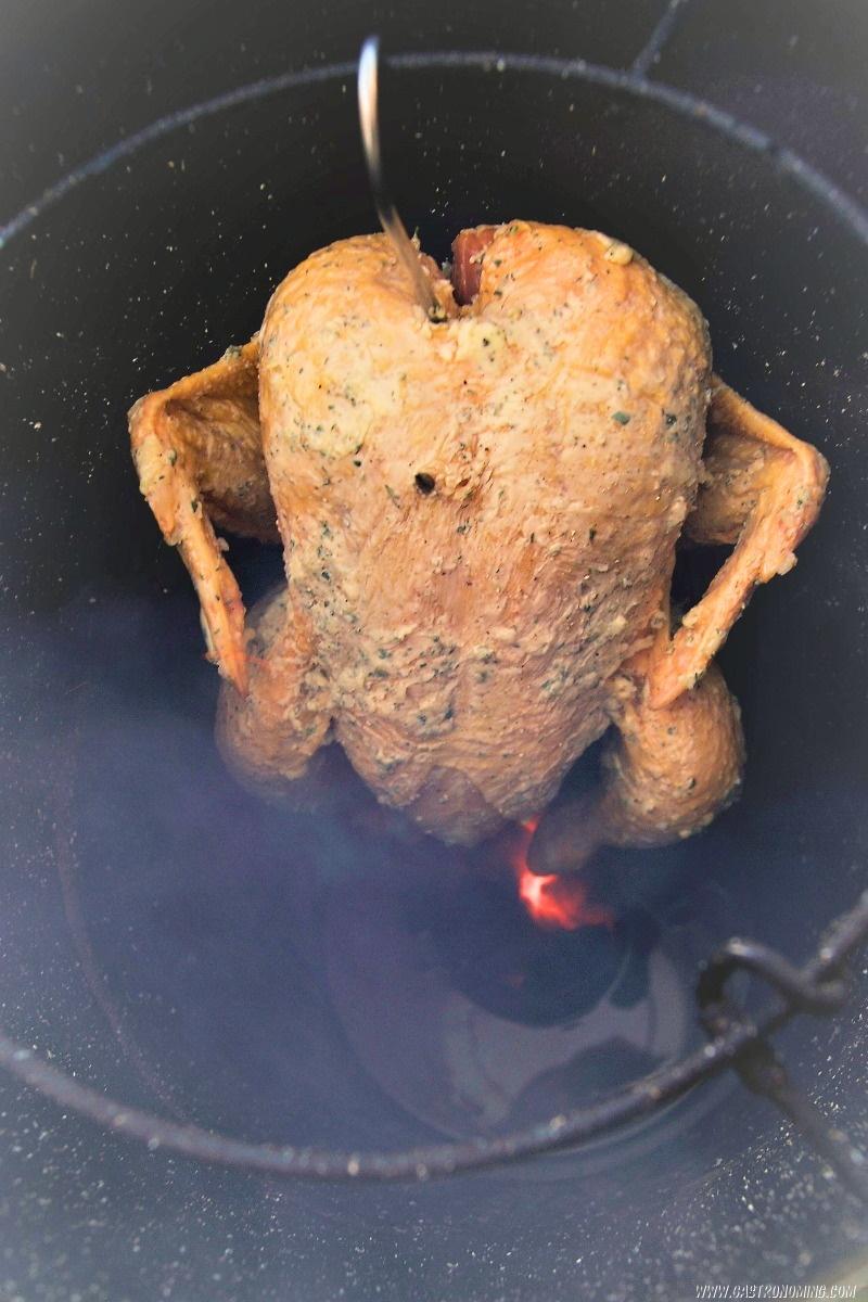 6. Metemos el pollo en nuestro cilindro con el menor “tiro” posible durante 1 hora y 15 minutos o hasta que esté bien dorado.
