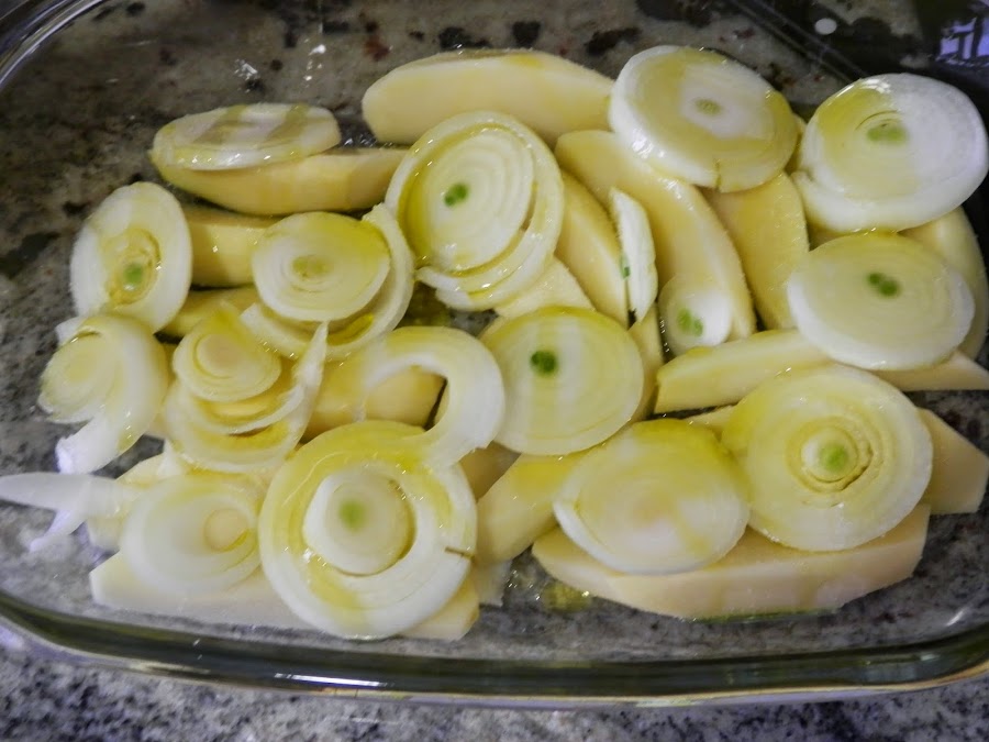 Pelamos las patatas y las cortamos en gajos, a veces si no hay mucho tiempo, las corto como si fueran para tortilla de patatas y se hacen en menos tiempo.