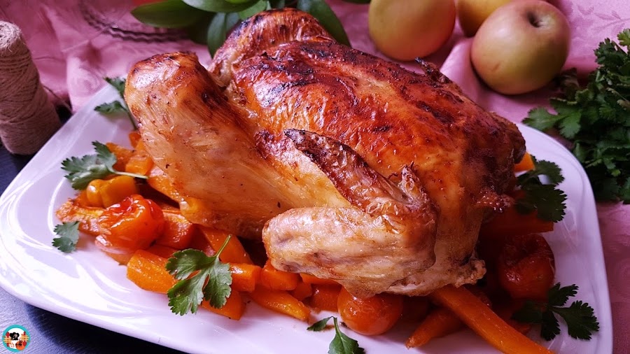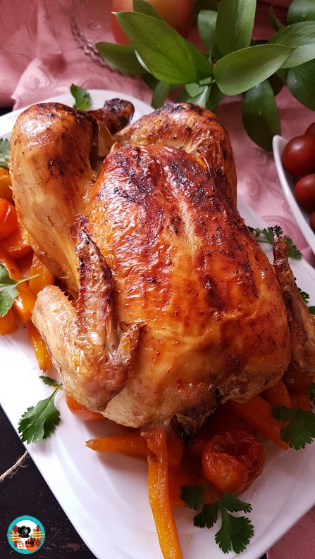 3.- Vertemos 1/2 vaso de Ron Miel por encima de pollo. Asamos el pollo con el ron miel 60 minutos a 180º, a la mitad del tiempo le damos la vuelta para que se cocine bien por todos los lados y le añadimos la sal. Retiramos el pollo asado del horno y lo servimos con las verduras.