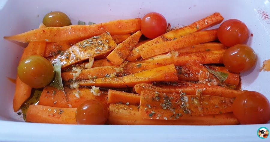 1.- Pelamos las zanahorias, las cortamos en trozos alargados. lavamos los tomates y los secamos. en una fuente de horno disponemos las verduras. las rociamos con un poco de aceite de oliva. añadimos los ajos picados, el orégano, el comino en polvo, la hoja de laurel y una cucharada de pimentón.