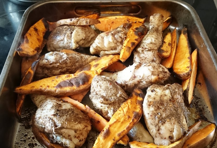 Se puede acompañar de verduras, arroz, patatas. En este caso lo acompañamos con boniatos.