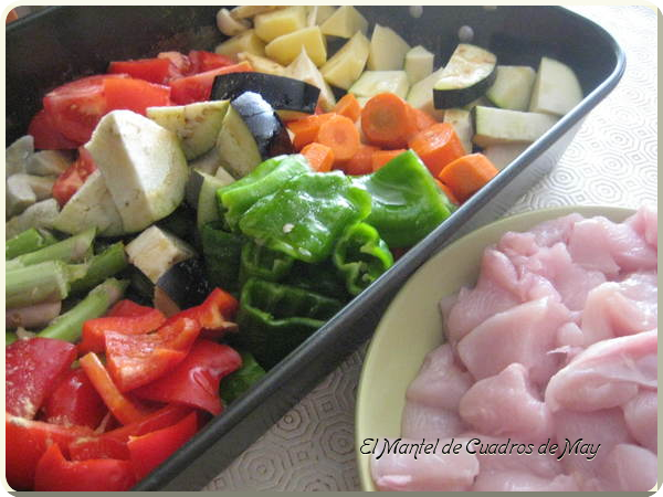 En una fuente de horno se colocan las verduras, el pollo encima y se riega todo con un chorrito de aceite.