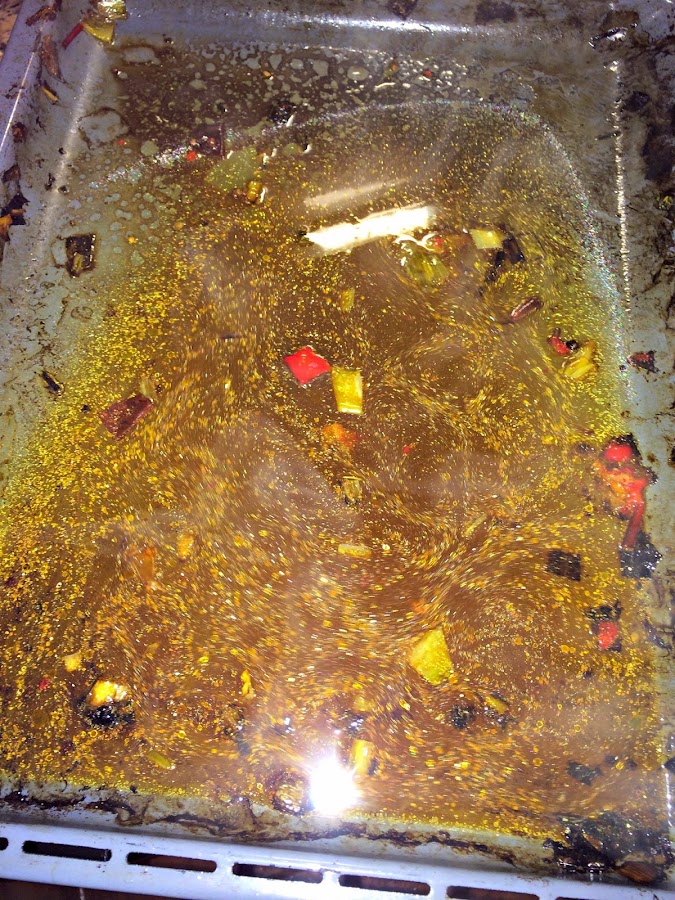 Cuando veamos que el pollo ya está en su punto, hora y media más o menos habrá pasado desde el comienzo, lo sacamos de la bandeja y vamos a desglasar la bandeja.