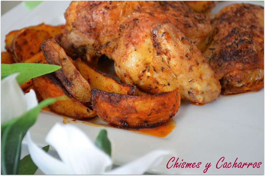 Ahora lavamos las patatas y las secamos, cortamos en gajos y pintamos con el adobo. Ponemos todo en una fuente para horno. Calentar el horno a 200º meter el pollo bajar a 180º y dejar asar 45 minutos. Sacar y servir acompañado de las patatas y una rica ensalada verde.