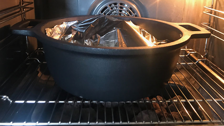 Vierte el otro medio vaso de agua en un recipiente metálico en el fondo del horno para producir humedad (opcional). Yo tengo un recipiente con piedras volcánicas de la barbacoa que ayudan a generar vapor. Sino, puedes poner todo el agua en el interior de la cazuela.