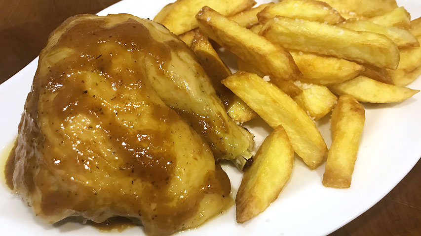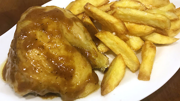 Aquí tienes un muslo con su salsa correspondiente y unas buenas patatas fritas para acompañar.