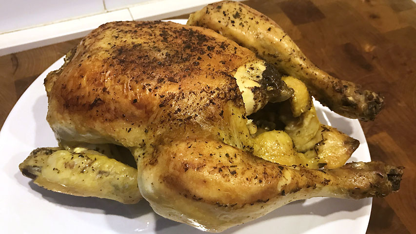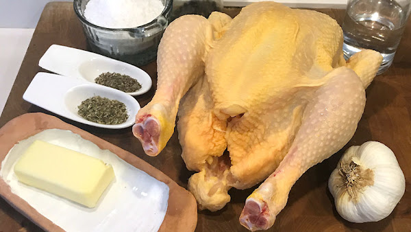El pollo salpimentado, con tomillo y orégano secos, la pechuga para abajo con los trozos de mantequilla, la cabeza de ajos y la rodaja de limón. Sencillo.