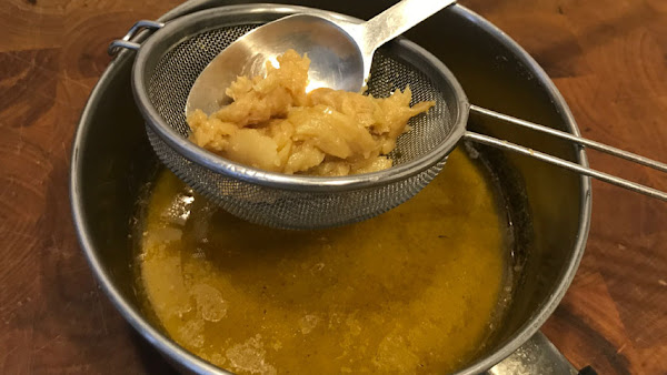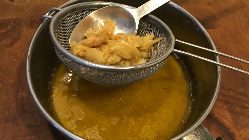 Cuela la pulpa del ajo asado sobre el jugo del cazo.