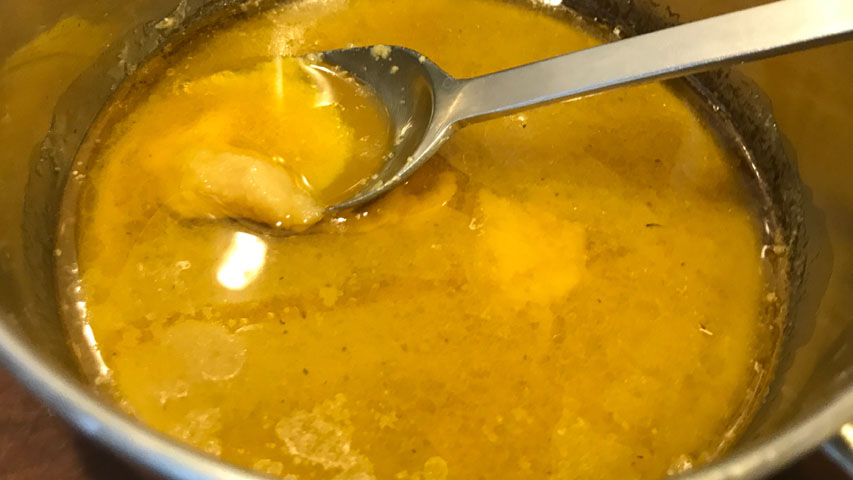Retira el trozo de limón y vierte los jugos del asado en un cazo usando un colador. Añade la pulpa de ajo también pasada por el tamiz.
